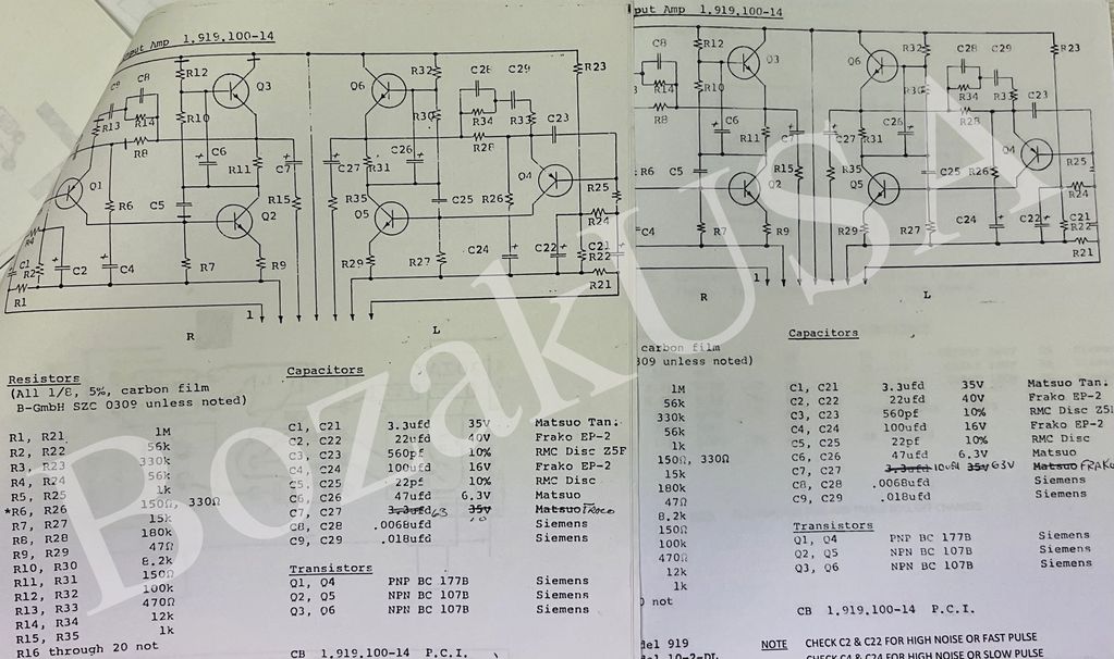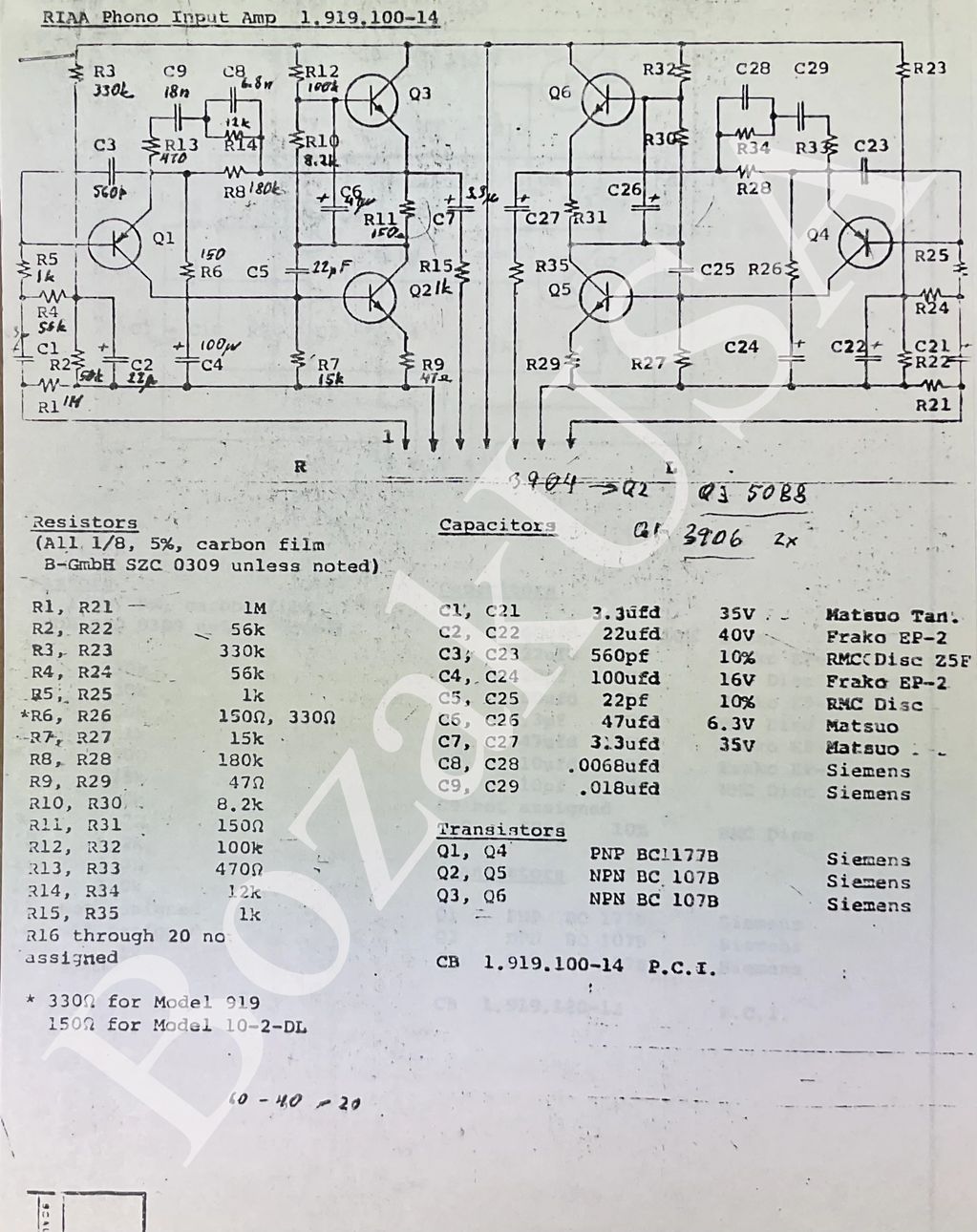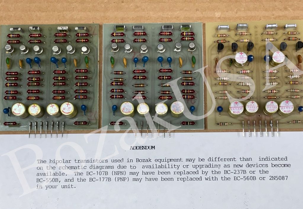 Original 1.919.100-14 component print from Bozak shows the only component variation being the 150/330 ohm resistor depending on the model mixer the card was installed in. These prints are from Sheldon Glick who was the last company owner.