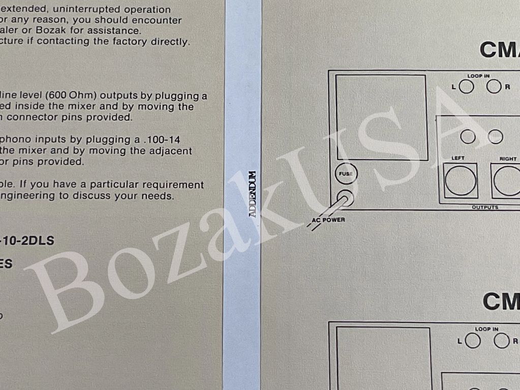 Later produced cards installed in the commercial CMA 10-2DL mixer had C7 and C27 updated. The 35 volt 3.3 Matsuo tantalum became a 63 volt 10ufd Fracko electrolytic. The update was made to accommodate DJs experiencing an issue. The change was hand written on company schematics and installed on all cards till production end.