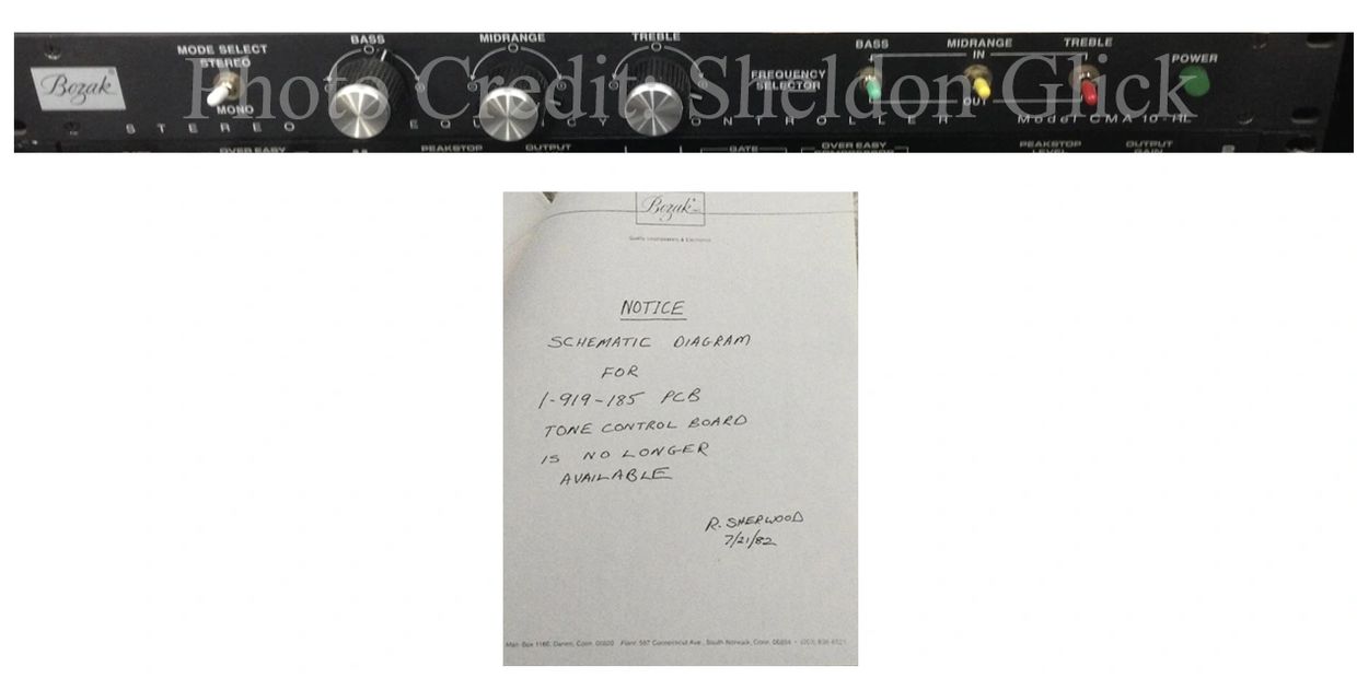 The Controller used circuit boards from the 919 mixer with several modified for installation. The original schematic was found at TAI Florida, however 1 of 5 pages stated “schematic no longer available" and signed by R Sherwood who in 1982 was in charge of file reorganization. It was joked about some schematics being hand written on note paper and never approved for production. This may not be a joke as so much red tape was involved in getting approval, tooling, and producing an actual product. Does the RL in the model number stand for Richard Long could never be confirmed. The in house designed CMA 10-2RL does exist but remains one of the original Bozak mysteries.