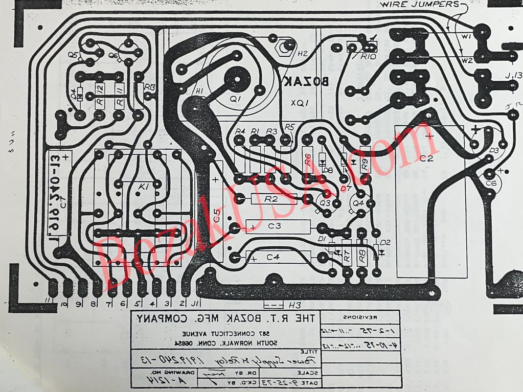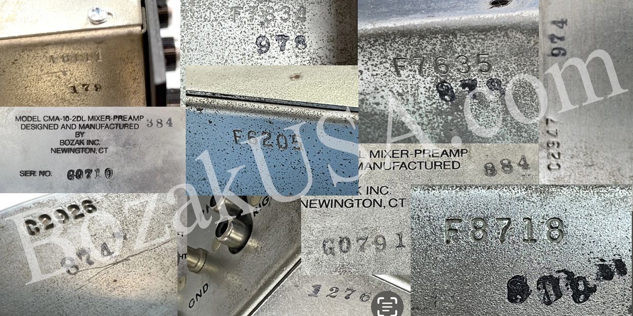 Many Bozak mixers are found with side stamped metal serial numbers and ink stamped production dates. By the mid 1980s many mixers were produced with only rear ink stamp serial numbers and dates. Last produced mixers have no externally identification but have an internal date.